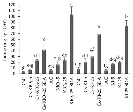 Considering those previous reports, the iodine concentrations utilized in the present work were well within the ranges used for lettuce cultivation. The best iodine species for biofortification is reportedly IO3− [12,13,43]. Our study found that Cs-KIO3 complexes (at 5 and 25 mg I kg−1) applied to the substrate led to biomass increases. Compared to KI, that iodine salt is less phytotoxic. Additionally, appropriate doses of chitosan have been found to stimulate plant growth, development, and yields [24,46]
