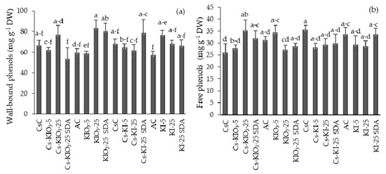 (a) Content of cell wall-bound phenols. (b) Content of free phenols measured in dry lettuce samples. Means with the same letter are statistically identical (LSD, p ≤ 0.05); the bars represent the standard error (n = 6).