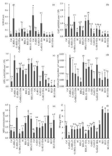 No experimental treatment produced significant differences, compared to the chitosan and absolute controls, for superoxide dismutase (SOD), catalase (CAT), reduced glutathione (GSH), glutathione peroxidase (GPX), nor total antioxidant activity (Figure 3). It appears that iodine treatments did not directly either contribute to an increase or decrease in catalytic and antioxidant activity, presumably because there was no plant stress generated. However, total protein content (TP) increased considerably after KI treatments, both at low (5 mg I kg−1) and high (25 mg I kg−1) doses applied either once or as split dose.