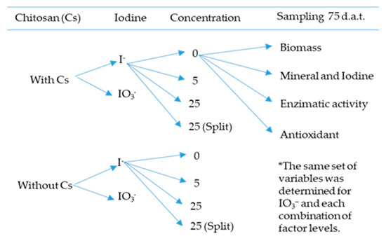 The present study was undertaken with the hypothesis that it would be possible to increase the absorption of iodine applied to substrate if it was applied as an iodine-chitosan complex. The objective was to determine if potassium iodide or iodate complexed with chitosan led to more effective lettuce biofortification than either salt in their uncomplexed forms.