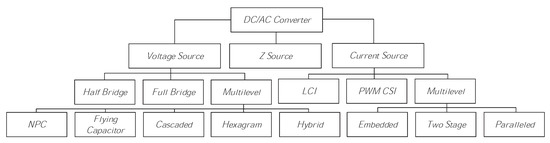 The DC/AC converters are used in a wide variety of applications, from power supplies [7,8,9], to high-power industrial applications [10,11,12]. At present, they are also used as an interface for the control of motors for electric vehicles [13]. However, one of the most important uses is the transformation of the direct current generated by the photovoltaic panels, accumulators or batteries, into alternating current [14]. There are many points of view from which inverters are classified, one of the essential classifications is made according to their power supply. In this way, three types of inverters are established—Voltage Source Inverter (VSI) [15], Current Source Inverter (CSI) [16] and Z-Source Inverter (ZSI) [17]. As a summary, the main classifications of these power converters are presented in Figure 2.