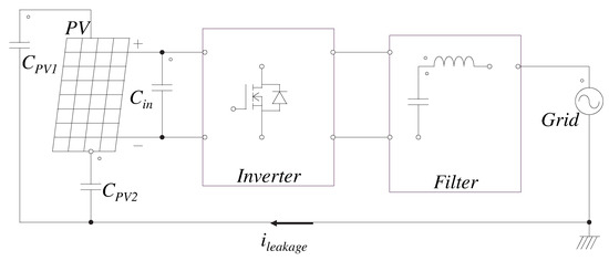 Transformerless inverters must eliminate, or at least, reduce the leakage current, for example, by including passive damping components or by modifying the modulation strategy [31]. In order to improve efficiency, transformerless topologies have been developed [28,32,33,34,35]. Generally, the inverters used in RE applications employ the VSI topology due to their low cost, easy control, and mature technology. The leakage current circulates through the physical earth of the grid and parasitic capacitances of each pole of the panel, as illustrated in Figure 3. This current impairs the functioning of the system, injecting harmonics into the grid and produces risks to human health.