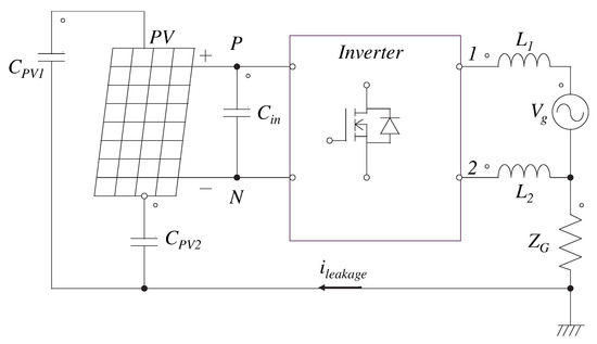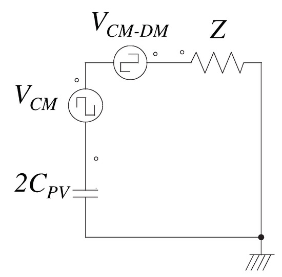 The use of transformers in the PV grid-connected systems guarantees isolation and eliminates the leakage current. These systems are expensive, heavy, bulky and low efficiency [51]. The current trend is focused on removing this device (transformer), in order to eliminate the aforementioned disadvantages [52]. However, removing the transformer is a new challenge, as the leakage current arises in the system. The leakage current is mainly affected by the variation of the voltage in common mode over time [53]. Taking as an example an inverter without transformer with complete bridge topology for a residential PV system connected to the single-phase grid, the equivalent CM circuit of Figure 5 is considered.