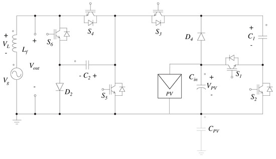 In transformerless systems, the use of common-grounded inverters is one of the most used topologies to prevent the leakage current. In these converters, the negative terminal of the PV is directly connected to the neutral point of the grid; therefore, the general CMV is removed correctly [55]. Today, other common-grounded schemes have tried to reduce the number of DC voltage sources by using capacitors [56]. Switched-Capacitor based inverters use the virtual dc-link concept to obtain two times boost factor within a single-stage operation without using any auxiliary inductors. For example, in Reference [57], a novel topology for the single-phase transformerless grid-connected inverters family is presented. This converter is shown in Figure 7.