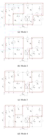 The modes of operation presented in Figure 10 depend on the direction of the grid current . Acting on the switches , TDFGI-H5 can be divided into four operating modes. In this case, according to the authors in [80,81], the leakage current is defined as in Equation (15). However, during the operating modes and remains constant. Therefore, the leakage current is eliminated.
