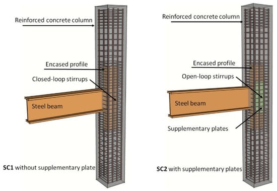To overcome this inconvenience, a novel RCS beam–column joint, in which an H steel profile covered by two supplementary plates embedded inside an RC column is directly welded to the steel beam, was proposed (Figure 2). The two supplementary plates are included in this design to avoid the stirrups resisting the shear in the connection region. A numerical study based on 3D finite element (FE) modeling recently performed by Nguyen et al. [15] indicated that the static behavior of this novel joint depended strongly on the length of the encased steel profiles. It has been observed that the presence of supplementary plates in joint regions allowed for the removal of the stirrups in this region. Furthermore, the parametric study performed with various lengths of supplementary plates pointed out that supplementary plates were useful only at the beam–column connection. However, the cyclic behavior of this type of connection has not been studied yet.