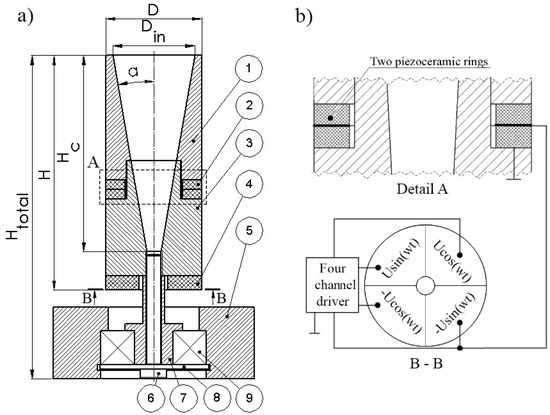 The dimensions of the actuator were obtained by numerical modeling and are described in detail in the next section. The conical hole of the waveguide was designed to amplify displacement and velocity amplitudes at the top surface of the waveguide. Moreover, due to the nonuniform stiffness of the waveguide, the node of the first longitudinal and second bending vibration modes was shifted down from the center of the cylinder; as a result, displacement amplitudes are amplified additionally because of the increased lever arm.