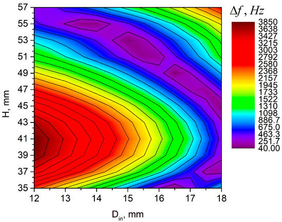 where H is the height of the waveguide; Din is the diameter of the conical hole; Δf is the difference in the natural frequencies of the first longitudinal and second bending vibration modes; wL1 is the natural frequency of the first longitudinal vibration mode; wB2 is the natural frequency of the second bending vibration mode; hmin and hmax are the minimum and maximum values of waveguide height; dmin and dmax are the minimum and maximum values of the base diameter of the conical hole; Hc is the height of the conical cavity; and hoffset is 8 mm, and it is the offset of the conical cavity from the bottom surface of the waveguide. The following boundary values of the design variables were used: hmin = 35 mm, hmax = 57 mm, dmin = 12 mm, dmax = 18 mm.