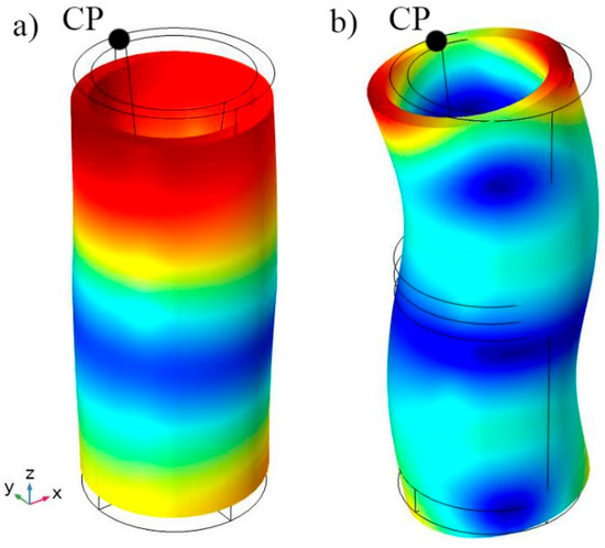 The vibration modes of the waveguide; (a) the first longitudinal vibration mode at 51,202 Hz; (b) the second bending vibration mode at 51,245 Hz; CP, contact point.