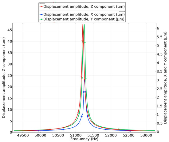 The amplitude–frequency and velocity–frequency characteristics of the contact point were studied as well. The amplitude of the excitation voltage was set to 200 Vp-p while excitation signals were applied to the piezoceramic rings, as shown in Figure 1b. The frequency range from 49 kHz to 54 kHz with a frequency step of 5 Hz was analyzed. The displacement and velocity amplitudes of the contact point located on the top surface of the waveguide were analyzed. The graph related to the displacement amplitudes is given in Figure 5. An analysis of the velocity amplitudes is given below Figure 5.