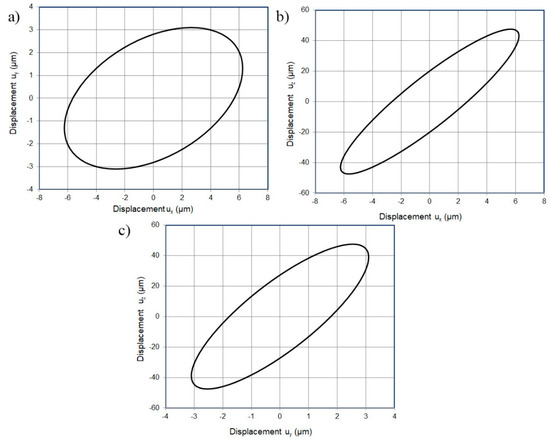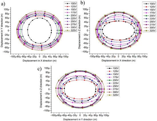 Analysis of Figure 11a revealed that the contact point has an elliptical displacement trajectory in the XY plane at different amplitudes of excitation voltages. The displacement amplitude in the X direction at 100 V excitation voltage is in the range from −42 µm to 41 µm, while that in the Y direction is from −64 µm to 60 µm. On the other hand, alternations in displacements at other excitation voltages are in the range from 126 µm to 164 µm in the X direction, while those in the Y direction are from 135 µm to 180 µm. It can be noted that the ratio between the increment of excitation voltage and generated displacements is low. The low ratio between excitation voltage increment and displacement amplitudes is influenced by geometrical parameters of the waveguide, i.e., displacement amplitudes generated by the second bending mode are suppressed by high stiffness of the waveguide, which is directly related to the diameter of the waveguide and ratio of the conical hole. On the other hand, the characteristics of displacement amplitudes in the XY directions show that the most effective excitation voltage for the actuator is 250 V because it exhibits the best ratio of displacement amplitude to excitation voltage, 0.656 µm/V.