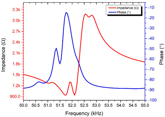 Firstly, measurements of the impedance–frequency and phase–frequency characteristics were performed. A 4192A impedance analyzer (HP, Palo Alto, CA, USA) was used for this purpose. The results of the measurement are shown in Figure 8. Two resonance frequencies can be seen in the plot. The first longitudinal vibration mode has a frequency of 51.75 kHz, while the second bending vibration mode has a frequency of 52.35 kHz. The difference between the resonance frequencies is 600 Hz. Compared to the results of modal analysis, this difference is notably higher. It is mainly caused by manufacturing errors, as well as slight differences in the material properties and actuator clamping.