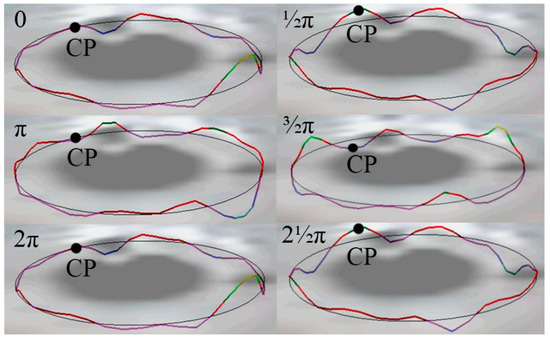 The mechanical characteristics of the actuator were measured as well. The experimental study was split into the following steps: experimental verification of the operating principle, measurements of the contact point displacement amplitudes in the XYZ directions, and rotation speed measurements. Firstly, experimental verification of the operating principle was performed. For this purpose, a PSV-500 scanning vibrometer was used (Polytec, Waldbronn, Germany). The goal of the measurements was to obtain trajectories of the contact point (CP) motion. The top surface displacements of the actuator were measured during one period of vibrations. The results of the measurements at 51.65 kHz are given in Figure 9.