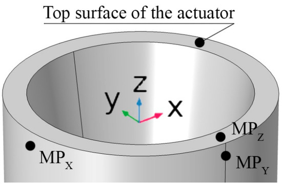 The results of contact point displacement trajectory measurements in the XYZ directions under different excitation voltages are given in Figure 11. It must be noted that three different points were measured; the measured points were located on the outside surfaces of the actuator for measurement in the X and Y directions, while a point located on the top surface of the actuator was measured in the Z direction. A schematic of the measurements is given in Figure 12.