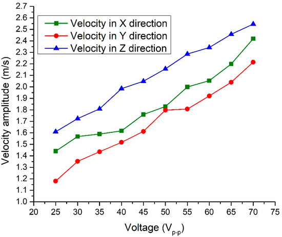 Figure 13 also presents velocity amplitudes in the X and Y directions. The lowest velocity amplitude in the X direction was obtained at 25 V and is 1.44 m/s, while the highest velocity amplitude in the X direction was obtained at 70 V and is 2.41 m/s. The difference between the highest and lowest velocity amplitudes is 0.97 m/s or 40.23%. It was found that the ratio of velocity increment to excitation voltage is 4.31 mm/s/V. The lowest velocity amplitude in the Y direction is 1.18 m/s at 25 V, while the highest velocity amplitude is 2.21 m/s at 70 V. The difference between the lowest and highest velocity amplitudes is 1.03 m/s or 46.72%. The ratio of velocity amplitude increment to excitation voltage is 4.57 mm/s/V.