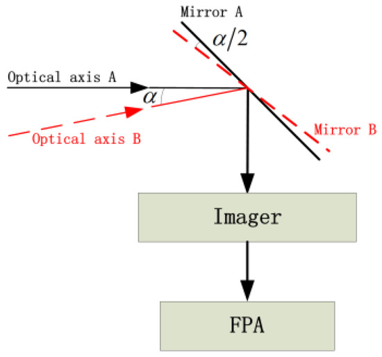 Figure 1 is a principle schematic diagram of utilizing the plane mirror to achieve the line of sight stability. It is assumed that the optical axis and the mirror are in the state A at the beginning of the exposure of the FPA. At this time, the light beam from the infinity object point on the optical axis is turned 90 degrees by the plane mirror, and then focused on the center of the FPA by the imager. During the exposure process, with the movement of the platform, the optical axis changes to the state B. The angle between the original optical axis A and the current optical axis B is α. By turning the mirror to the state B, the angle between the mirror A and the mirror B is α/2. The light beam from the infinity object point on the optical axis is turned by the mirror, and then still focused on the center of the FPA by the imager. The change of the optical axis is compensated by the change of the angle of the mirror. During the integration time of the FPA, the light beam from the infinity object point on the optical axis is always focused on the center of the FPA.