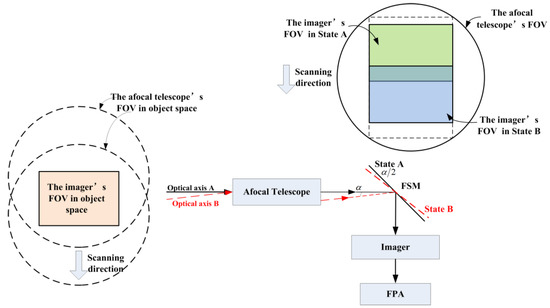 Figure 4, the imager’s FOV is scanned through the afocal telescope’s FOV. The green box represents the imager’s FOV at the earlier point in State A. The blue box represents the imager’s FOV at the later point in State B. The black circle represents the afocal telescope’s FOV. The gray arrow represents the scanning direction. The corresponding back-scanned imager’s FOV in object space are also showed. The afocal telescope’s FOV is scanning to the down, while the FSM moves to keep the imager’s FOV (the orange box) fixed during the integration time.