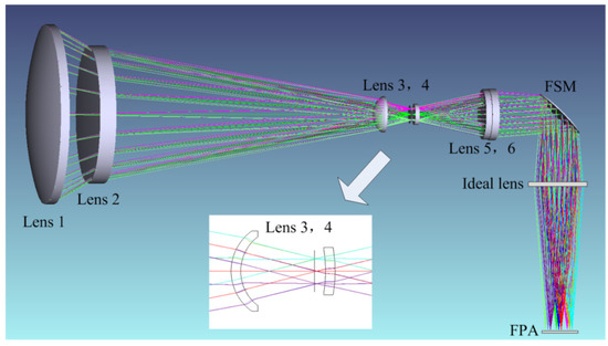 Figure 5. The afocal telescope is consisted of six lenses. From left to right, the lens 1, the lens 3, the lens 4, and the lens 5 are made of silicon and have a positive power. The lens 2 and the lens 6 are made of germanium and have a negative power. The entrance pupil is placed on the front surface of the lens 1. The rear surface of the lens 2 is a quadratic aspherical surface. The lenses 3 and 4 are field lenses, and have a small power. The rear surface of the lens 3 and the front surface of the lens 4 are freeform surfaces. The remaining surfaces are spherical. The FSM is placed on the exit pupil of the afocal telescope, and the optical axis is turned by 90 degrees. The ideal lens imager focuses the scene onto the FPA.