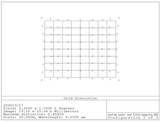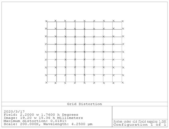 Figure 11 shows the grid distortion map. In order to visualize the distortion characteristics, the distortion deviation is enlarged by 200 times. As can be seen from the figure, this optical system still displays symmetrical barrel distortion. The field mapping of Equation (6) minimizes image wander for field points along a single axis. Line-scan systems can use this mapping and achieve adequate results. However, this optimal one-dimensional field mapping is not ideal for two-dimensional imaging systems.