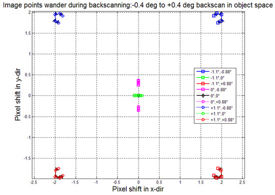 Figure 7, except for the central image point, the other off-axis image points have image wander. The image wander at the four edge fields of view is the largest. Compared with the case when the fast steering mirror has no motion, the maximum image blur during the back-scan is only 0.22 pixels. The image point motion caused by projection distortion is well controlled.