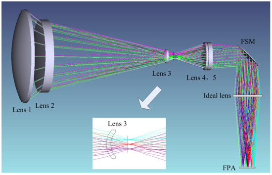 Figure 8. The afocal telescope is composed of five lenses. From left to right, the lens 1, the lens 3, and the lens 4 are made of silicon and have a positive power. The lens 2 and the lens 5 are made of germanium and have a negative power. The entrance pupil is placed on the front surface of the lens 1. The rear surface of the lens 2 is a secondary aspheric surface, and the remaining surfaces are spherical. The lens 3 is a field lens, and the optical power is very small. The fast steering mirror is placed on the exit pupil of the afocal telescope, and the optical axis is turned by 90 degrees. The imager focuses the scene onto the FPA. The optical system have good imaging performance and low pupil aberrations.