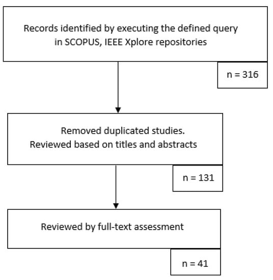 It should be noted that recently Rybarczyk and Zalakeviciute published a paper about ’Machine learning approaches for outdoor air quality modelling: A systematic review’ [11]. By reviewing this paper, we have defined key features which were taken into consideration during our study. In the first place, we have narrowed the scope of the models by choosing only forecasting models, while the authors mentioned above also included papers concentrated on the estimation models. Another reduction is that we selected papers in which only sensor data in the smart cities context are being used. After these steps and after excluding duplicated manuscripts and reviewing titles and abstracts, the filtration output reached 131. Finally, applying quality assessment, irrelevant papers were excluded, and as a result, we had 41 selected papers. The key questions, on which we focused during the quality assessment, are listed below: