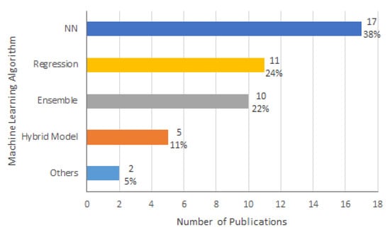 This section includes a brief description of each selected paper, involving applied methods and obtained results. We grouped the papers based on machine learning algorithms represented in Figure 4 (NN, Regression, Ensemble, Hybrid Model, Others).