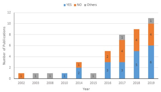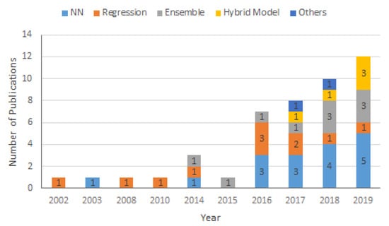 Algorithms: having information about the distribution of the publications per each machine learning algorithm (Figure 4), it would be interesting to know how the usage of the algorithms changed throughout the years. Figure 5 presents the publications for each machine learning algorithm over the years. It can be noted that, in recent years, the number of publications (used neural network, ensemble and hybrid models) has an increasing trend, which is not applicable to the regression method. The latter one has been applied since 2002 almost with the unchangeable trend, moreover, in recent publications, the regression method was mainly applied along with other algorithms for comparison purposes.