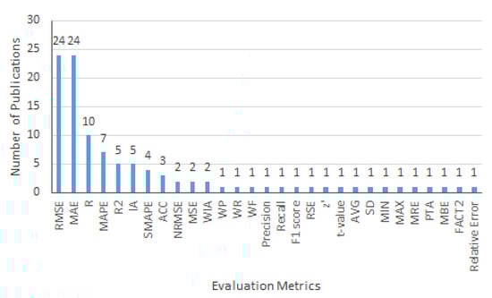 Evaluation Metrics: are the metrics used in order to measure applied methods. Figure 6 displays for each metric the number of publications where the metric was applied. We can notice that the most used metrics are RMSE (Equation (1)) and MAE (Equation (2)), each of them applied in 24 publications.