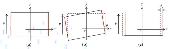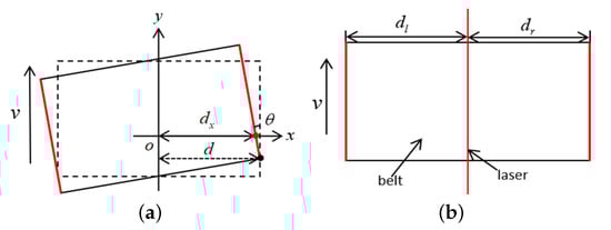 A rectangular coordinate system consisting of x-axis and y-axis was given, the edge of the conveyor belt is always parallel to the y-axis direction and consistent with the speed when the conveyor belt runs normally and no deviation occurs. At this point, we define the distance from any point on the right edge of the conveyor belt to the y-axis, d. When the conveyor belt is deflected or completely offset, the intersection point of the right edge of the conveyor belt and the x-axis will change. As shown in Figure 3a, after the conveyor belt is deflected to the left, , and a deflection angle will appear at the same time.