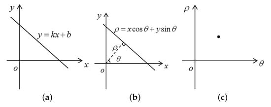 Diagram of coordinate system transformation: (a) the expression of line in image space, (b) the expression of line in image space, (c) the expression of line in parameter space. These three expressions are equivalent.
