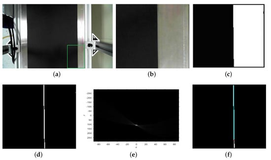 Image processing results using Method 1: (a) original image, (b) region of interest, (c) binary image, (d) result of Canny algorithm, (e) line in the parameter space, (f) result of Hough transform.