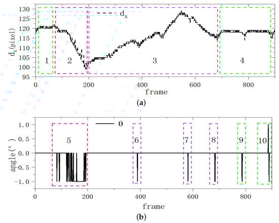 Figure 5d shows the edge detection results of the Canny algorithm. We performed a Hough transform on the edge detection results to get the straight line in the parameter space shown in Figure 5e, and the straight lines in image space shown in Figure 5f. Then we extracted the abscissa of the intersection of the straight line and the x-axis in the image space and the angle in the parameter space. The results are shown in Figure 6.