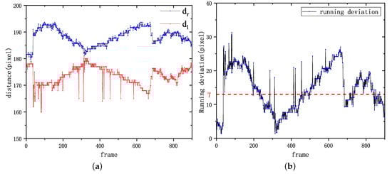 The two curves in Figure 8a respectively represent the distance between the left and right edges of the conveyor belt and the laser reference line, and Figure 8b shows the difference between the two distances. When we set a threshold T in Figure 8b, when the difference between the two distances exceeds this threshold T, the system will issue an alarm and make the deviation device act and adjust the deviation in time to avoid failure. This method also accurately reproduces the process of simulating the deviation of the conveyor belt.