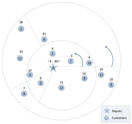The total customer demand of the depot A is 205 and the vehicle capacity is 80, therefore the number of sectors for the depot A is three. According to the forward order of the customer polar coordinate, the customers belonging to the inner and outer circle are randomly grouped into three sectors, respectively. The total customer demand within each sector does not exceed 80. A result of the segmentation is shown in Figure 2. The arrows in the figure indicate the direction of segmentation. The sectors within the inner circle are: [10, 7, 1, 3], [5], [12, 8], the sectors within the outer circle sectors are: [6], [2, 11], [4, 9, 13].