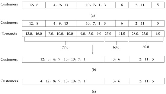 As shown in Figure 4b, the total customer demand of the sector [12, 8] is 29.0, the total customer demand of the sector [4, 9, 13] is 27.0, and the sum of two sectors is 56.0, which does not exceed the vehicle capacity, 80.0. Therefore, the two sectors are grouped into one sector [12, 8, 4, 9, 13]. The total customer demand of the next sector [10, 7, 1, 3], 48.0, 56.0 + 48.0 = 104.0, exceeds the vehicle capacity, 80.0, so the customers in the sector [10, 7, 1, 3] are selected to add to the sector [12, 8, 4, 9, 13] in order. The result is that 10, 7, 1 have been added to the sector [12, 8, 4, 9, 13]; therefore, customers 12, 8, 4, 9 13, 10, 7, 1 are assigned to a vehicle and the sector [3] is left as the current sector, and so on. As a result, as shown in Figure 4b, the customers 12, 8, 4, 9, 13, 10, 7, 1 are assigned to the first vehicle, and the customers 3 and 6 are assigned to the second vehicle, and the customers 2, 11, 5 are assigned to the third vehicle.