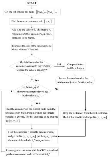 Next, the merging operation of the nearest customer pair on the list must be performed. The merging rule is that the later customer in the pair is added to the route of the vehicle where the previous customer is located, and another customer of the vehicle paired with other customers is recorded. Finally, the customers are rearranged with the CWS method and get the new customer sequence visited by the vehicle . The order of the two customers in the pair is switched and the merging operation on the new pair is performed.