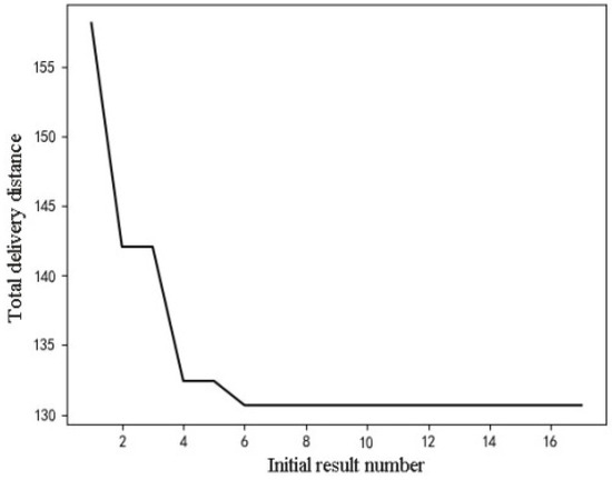 The iteration curve of depot A is shown in Figure 9. Compared with the initial solution, after 30 iterations, the objective function of the final solution is reduced by 29.5 and has converged at the 8th iteration. The iteration curve of depot B is shown in Figure 10. After 18 iterations, the final solution reduces the distance of 27.44 compared with the initial solution. The curve has converged at the 6th iteration. It can be seen that the merge-head and drop-tail strategy improves the initial solution quickly, and the number of iterations is small so that a better solution can be obtained quickly.