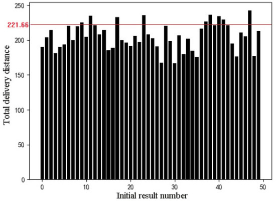 The sector combination optimization algorithm makes the initial solutions more abundant and better, compared with other iterative algorithms only using one initial solution such as the genetic algorithm adopted by Ho et al. [8] and granular Tabu search algorithm adopted by Escobar et al. [21]. Ho et al. adopted the CWS method to get a solution for initialization. For the small problem with 13 customers, the objective function value of the solution obtained by CWS is 221.66, and the objective function values of 50 initial solutions obtained by the sector combination optimization algorithm fluctuate between 150 and 250, of which 82% is below 221.66, as shown in Figure 11. For the two depots with 249 customers of the instance 8, as shown in Table 1, the objective function value of the solution obtained by CWS is 4671.2, and the objective function values of 50 initial solutions obtained by the sector combination optimization algorithm fluctuate between 2500 and 3500, of which 100% are below 4671.2. It can be seen that the initial solution obtained by the sector combination optimization algorithm is better. With these solutions as the initial population of the genetic algorithm and ant colony algorithm, the number of iterations can be reduced to achieve fast convergence. Additionally, because of the abundant initial solutions, the algorithm can avoid trapping in a local optimum.