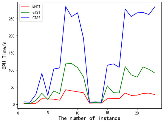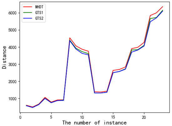 Escobar et al. proposed a hybrid granular Tabu search (GTS) algorithm for the MDVRP based on a cluster approach like our algorithm while they aimed to find the best solutions. The initial MDVRP solution is obtained by using a hybrid initial procedure (GTS1) and improved by the granular Tabu search procedure (GTS2). We illustrate the performance of the two algorithms in terms of CPU time and distance for comparisons. Combing Figure 12 with Figure 13, we conclude that the CPU time consumed by our algorithm is obviously lower than theirs while the distance Gap of our results is less than seven in all instances.
