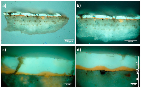 Figure 2d: (1) an uppermost white-opalescent layer, 40 µm thick approximately; (2) a thinner (circa 15 µm) fluorescent orangish layer; (3) a very thin (submicron) black layer, likely ascribable to the silver leave; and (4) a very thick whitish preparation layer showing (