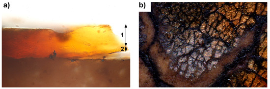Layers (1) and (2) were distinctly observed only with the UV-light. The same layers observed under VIS-light Optical Microscopy (OM) appeared as a unique layer of yellow color (see