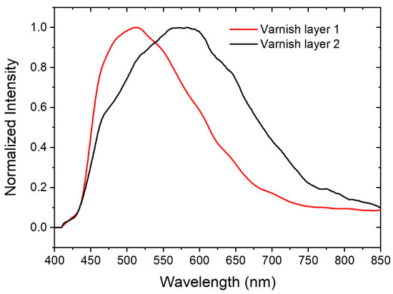 max) were found at about 500 (136 nm, measured at Full Width Half Maximum (FWHM) of the band) and 580 nm (230 nm FWHM) for the varnish layer 1 and 2, respectively, according to the scheme shown in