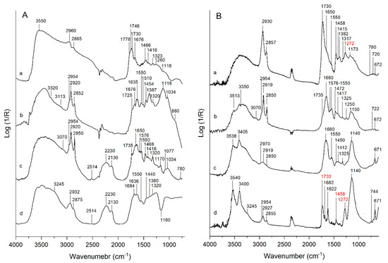 Figure 5B, spectrum d). In spectrum d, some weak bands not ascribable to the ground and red-labeled were attributable to the polyester embedding resin (1731, 1458, 1256, and 1275 cm
