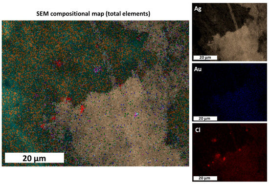 27]. The presence of chlorine (Cl) and sulphur (S) was ascribable to the degradation products of the silver leaf and Ag sulphide was detected by micro-Raman spectroscopy (see after). The confirmation of the provenance of Au from the Ag layer was achieved mapping the elemental composition of an extended area. In this respect,