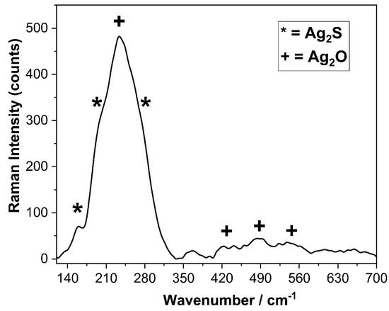 28]. Micro-Raman spectroscopy carried out with a 100× objective yielding a 2 µm-sized laser spot on the sample allowed a punctual analysis of the silver layer and enabled the identification of the corrosion and oxidation products of silver.
