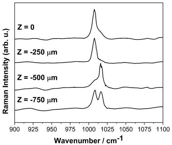 30]. The impossibility of keeping the adequate temperature constant caused uneven cooking of gypsum, which led to a mixture of anhydrite and calcium sulphate dihydrate. In this respect, a Raman analysis mapping performed at different depth (Z) on the ground of the cross-section (