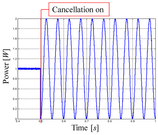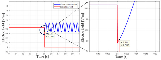 Figure 7 is the result of the combination of the interference signal and the internal AC signal at 0.5 s after the external IEMI is incident, and before the MPM is applied. In the MPM method, the cancellation was completed after a total of 100 ms of time, and the result was a red line. At this time, if the number of sampling was reduced to reduce the blind time, accurate estimation was not made, and the signal was amplified after cancellation. When applying the MPM, singular values are shown in