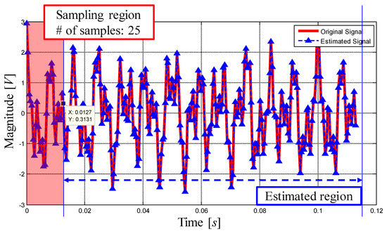 Figure 3 shows the results of estimating randomly generated signals using MPM. The red line represented the original signal and generated a signal with a total of 250 points. At this time, the estimation was performed using only about 1/10 of the signals. The red area shown in the