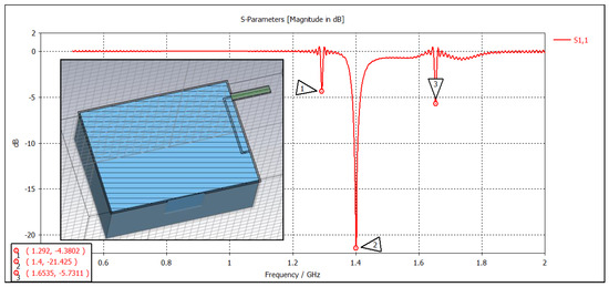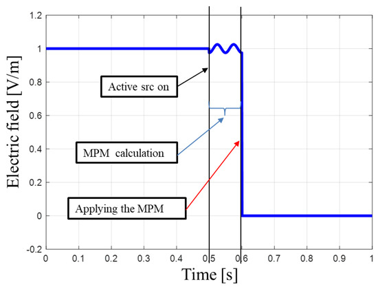 8], the experiments were conducted using the vehicle model. In this experiment, the scaled-down model was used, and the canceling was carried out using a magnetic loop feeder inside the vehicle engine room. It took 155~188 ms for MPM analysis and cancellation, and 400~500 ms in total. The MPM operation relies on the performance of the computer’s Central Processing Unit (CPU) because it takes the measured value from the power meter to the user’s computer and processes it. In this paper, the vehicle engine room part was simulated similarly to the above situation. The size of the resonator and input path of IEMI is as below in